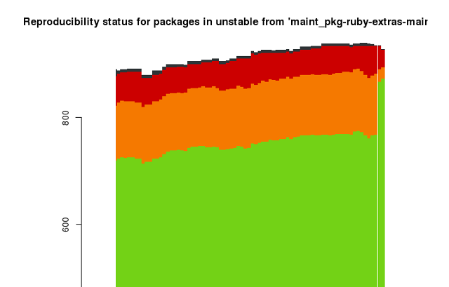 Earlier today I was made aware by Holger of the results of our reproducibility efforts during the sprint. I would like to thank Lunar for pinging us about the issue, and Holger for pointing me to updated results. The figure below depicts a stacked area chart where the X axis is time and the green area is reproducible packages. Red is packages that fail to build, and Orange are unreproducible packages